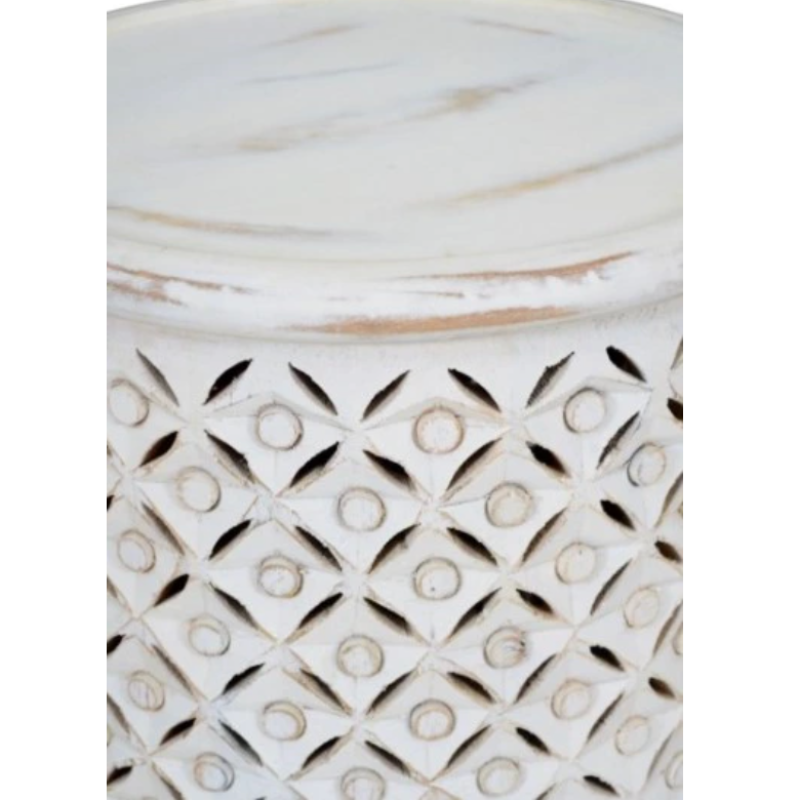 This mango wood accent table features intricate detailing and an antique finish, adding interest to any room. With its compact, round design and neutral colour, it offers both style and versatility.