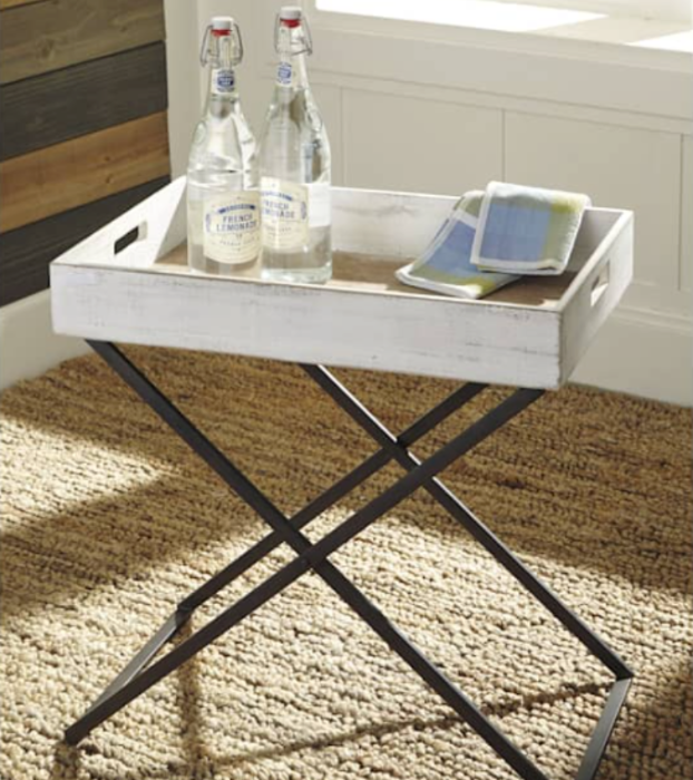 Casually cool style served with a side of bygone charm. Pairing solid wood and metal, this accent table with “tray” top commingles a distressed aesthetic with clean-lined, modern appeal. Combination of three finishes gives this simply striking table so much distinction.