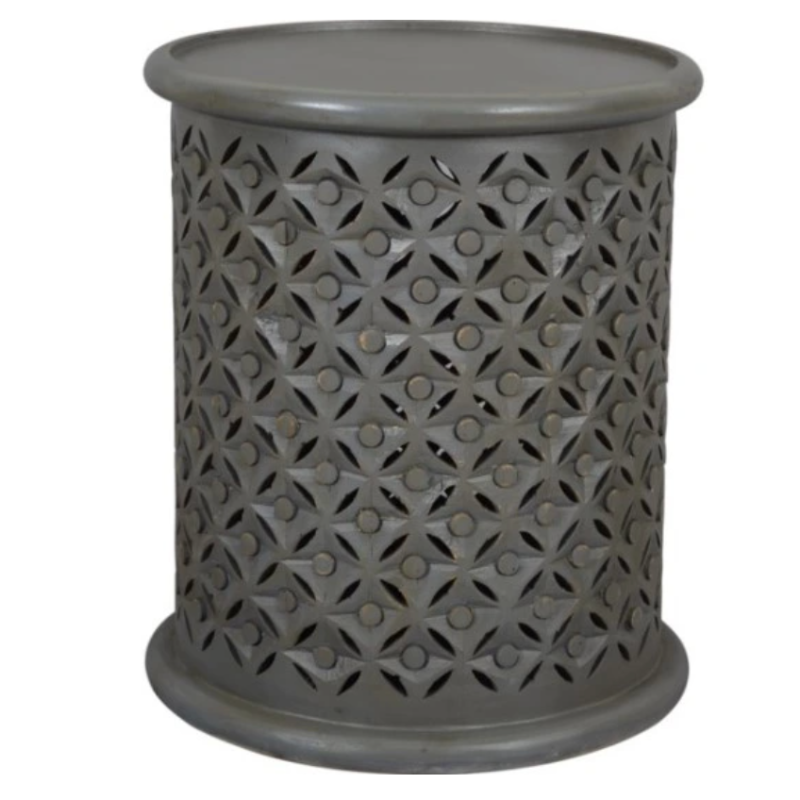 This mango wood accent table features intricate detailing and an antique finish, adding interest to any room. With its compact, round design and neutral colour, it offers both style and versatility.